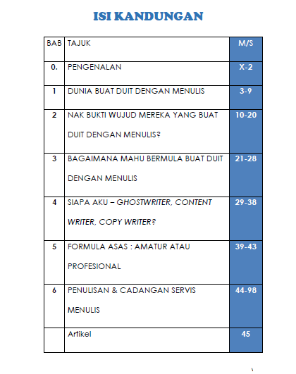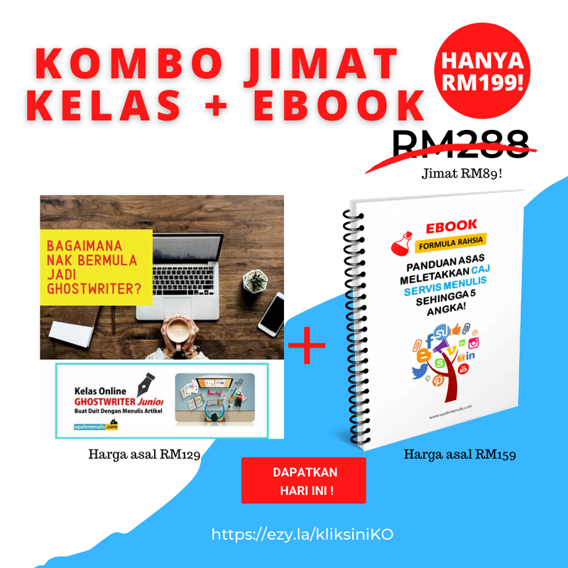 ATAU BOLEH DAPATKAN PAKEJ JIMAT RM89, DAFTAR KELAS ONLINE GHOSTWRITER & EBOOK FORMULA MELETAKKAN CAJ SERVIS MENULIS DENGAN HARGA KOMBO RM199 SAHAJA!